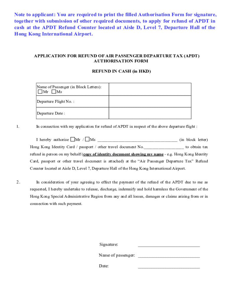 Note to applicant: You are required to print the filled Authorisation Form for signature, together with submission of other required documents, to apply for refund of APDT in cash at the APDT Refund