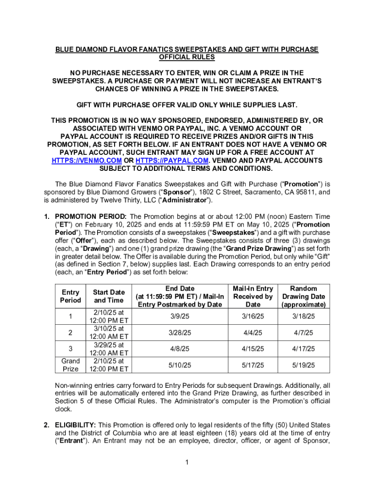 BLUE DIAMOND FLAVOR FANATICS SWEEPSTAKES AND GIFT WITH PURCHASE OFFICIAL RULES NO PURCHASE NECESSARY TO ENTER, WIN OR CLAIM A PRIZE IN THE SWEEPSTAKES. A PURCHASE OR PAYMENT WILL NOT INCREASE AN ENTRANTS