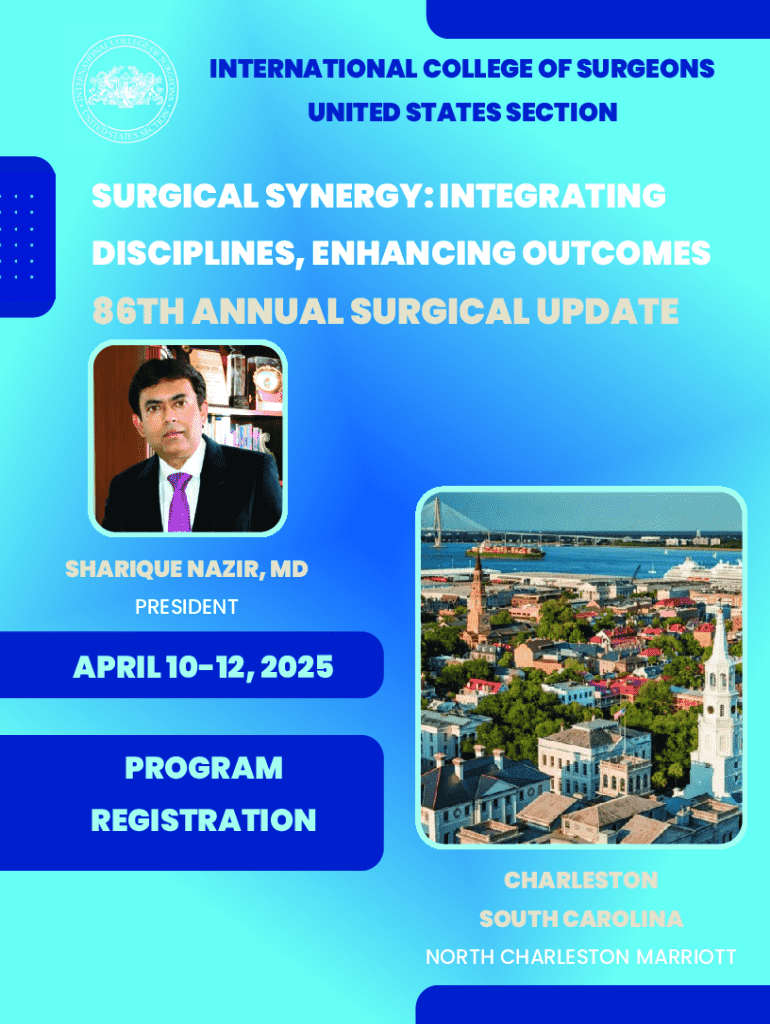 INTERNATIONAL COLLEGE OF SURGEONS UNITED STATES SECTIONSURGICAL SYNERGY: INTEGRATING DISCIPLINES, ENHANCING OUTCOMES86TH ANNUAL SURGICAL UPDATESHARIQUE NAZIR, MD PRESIDENTAPRIL 1012, 2025 PROGRAM REGISTRATION CHARLESTON SOUTH CAROLINA NORTH CHARLESTON MARRIOTT 1A WELCOME FROM THE PRESIDENT Dear Colleagues, It is with great pride and excitement that I invite you to the 86th Annual Surgical Update of the International College of Surgeons United States Section (ICSUS), taking place