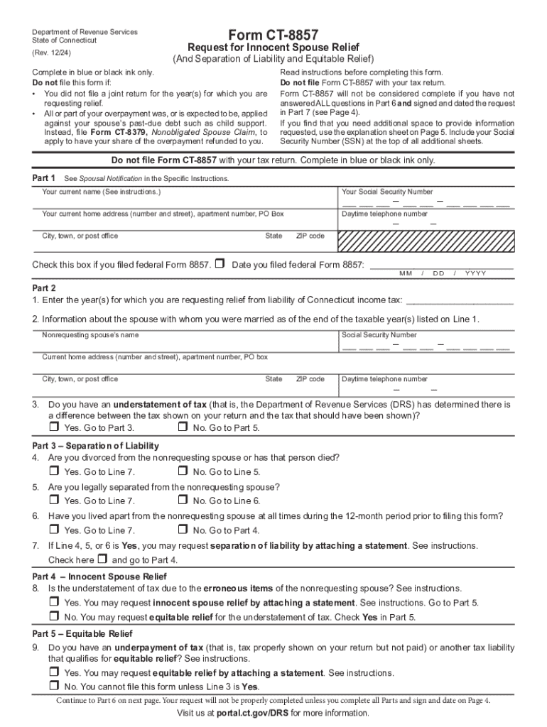 Form CT8857Department of Revenue Services State of Connecticut (Rev. 12/24)Request for Innocent Spouse Relief(And Separation of Liability and Equitable Relief)Complete in blue or black ink only. Do