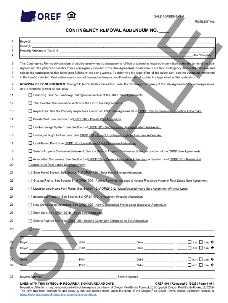 Este addendum se utiliza cuando se cumple o se renuncia a una contingencia según los términos del Acuerdo de Venta. La parte que se beneficia de una contingencia inicia el uso de este addendum y selecciona las contingencias que han sido cumplidas o se están renunciando.
