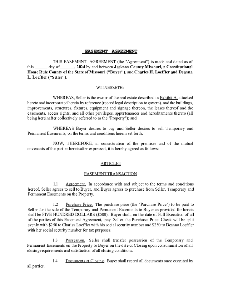 Este documento es un acuerdo de servidumbre que establece los términos y condiciones bajo los cuales Jackson County Missouri (Comprador) adquiere servidumbres temporales y permanentes de Charles H. Loeffler y Deanna L. Loeffler (Vendedor). Incluye detalles sobre el precio de compra, representaciones y garantías de ambas partes, y condiciones para el cierre del acuerdo.