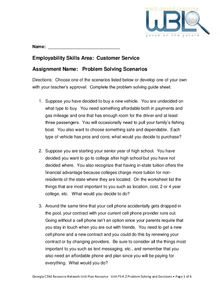 Name: ___Employability Skills Area: Customer Service Assignment Name: Problem Solving Scenarios Directions: Choose one of the scenarios listed below or develop one of your own with your teachers approval.