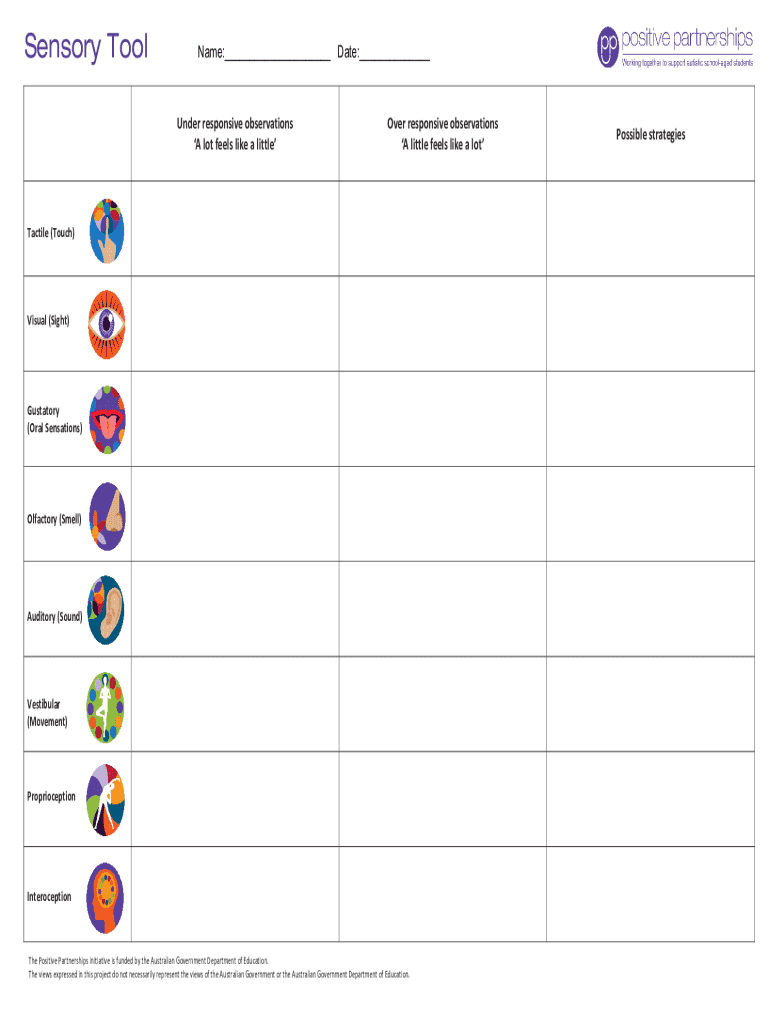 Sensory Tool Name:___ Date:___ Underresponsiveobservations AlotfeelslikealittleOverresponsiveobservations AlittlefeelslikealotTactile(Touch)Visual(Sight)Gustatory (OralSensations)Olfactory(Smell)Auditory(Sound)Vestibular