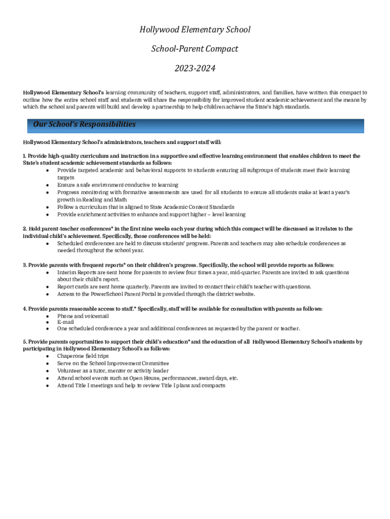 The school-parent compact must report information such as the academic goals, parent responsibilities, student responsibilities, and how the school will support student learning.