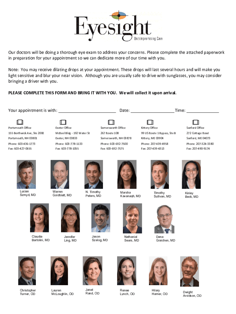 Our doctors will be doing a thorough eye exam to address your concerns. Please complete the attached paperwork in preparation for your appointment so we can dedicate more of our time with you. Note: