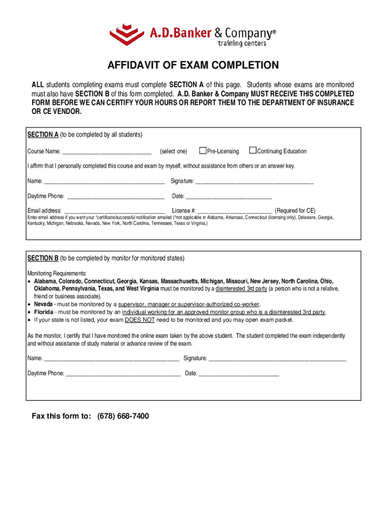 This form is required for students completing their exams to affirm their independent completion of the course and exam. It also includes requirements for monitoring and submission to A.D. Banker & Company for certification.