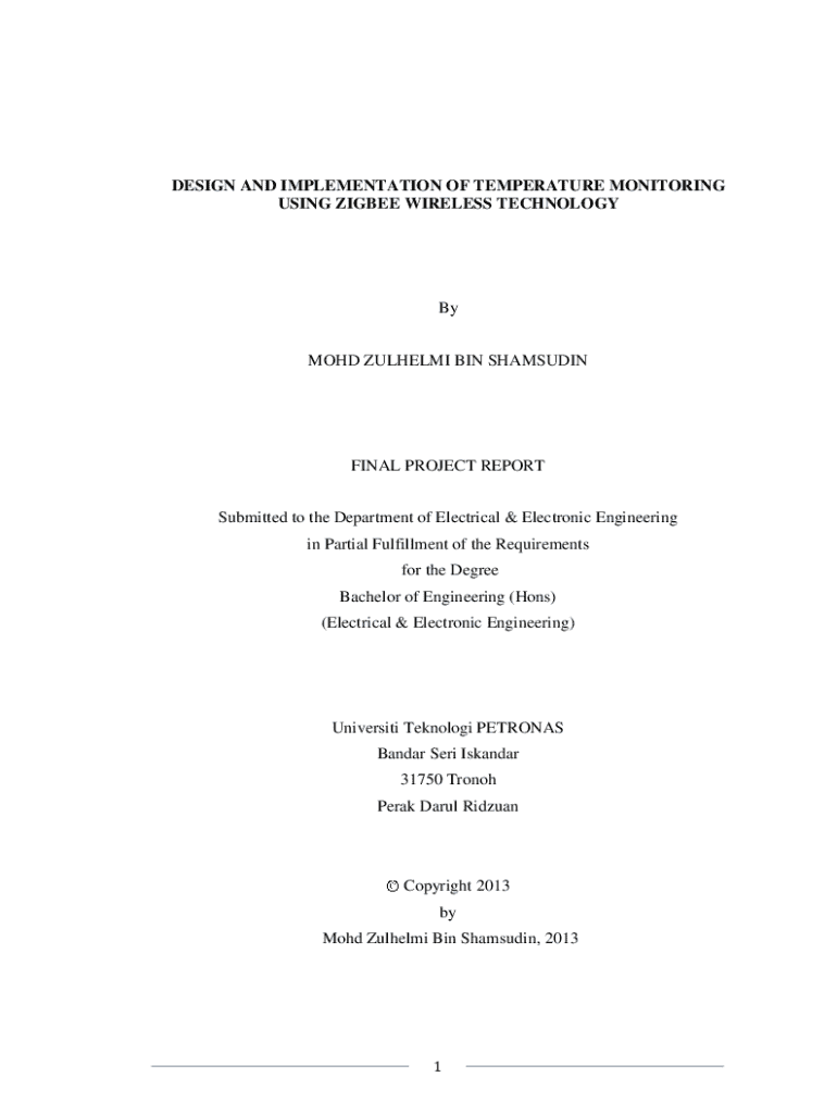 DESIGN AND IMPLEMENTATION OF TEMPERATURE MONITORING USING ZIGBEE WIRELESS TECHNOLOGYBy MOHD ZULHELMI BIN SHAMSUDINFINAL PROJECT REPORT Submitted to the Department of Electrical & Electronic Engineering in Partial Fulfillment of the Requirements for the Degree Bachelor of Engineering (Hons) (Electrical & Electronic Engineering)Universiti Teknologi PETRONAS Bandar Seri Iskandar 31750 Tronoh Perak Darul RidzuanCopyright 2013 by Mohd Zulhelmi Bin Shamsudin, 20131CERTIFICATION CERTIFICATION