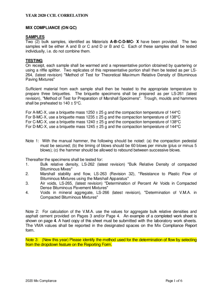 This document outlines the procedures and requirements for testing bulk samples of materials for mix compliance in the year 2020. It includes guidelines for sample preparation, testing methods, and the reporting of results related to bituminous paving mixtures.