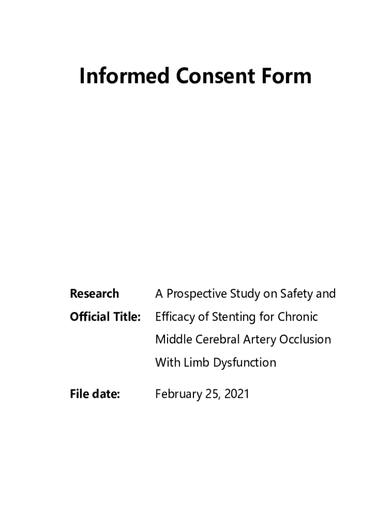 Informed Consent FormResearchA Prospective Study on Safety andOfficial Title:Efficacy of Stenting for Chronic Middle Cerebral Artery Occlusion With Limb DysfunctionFile date:February 25, 2021A Prospective