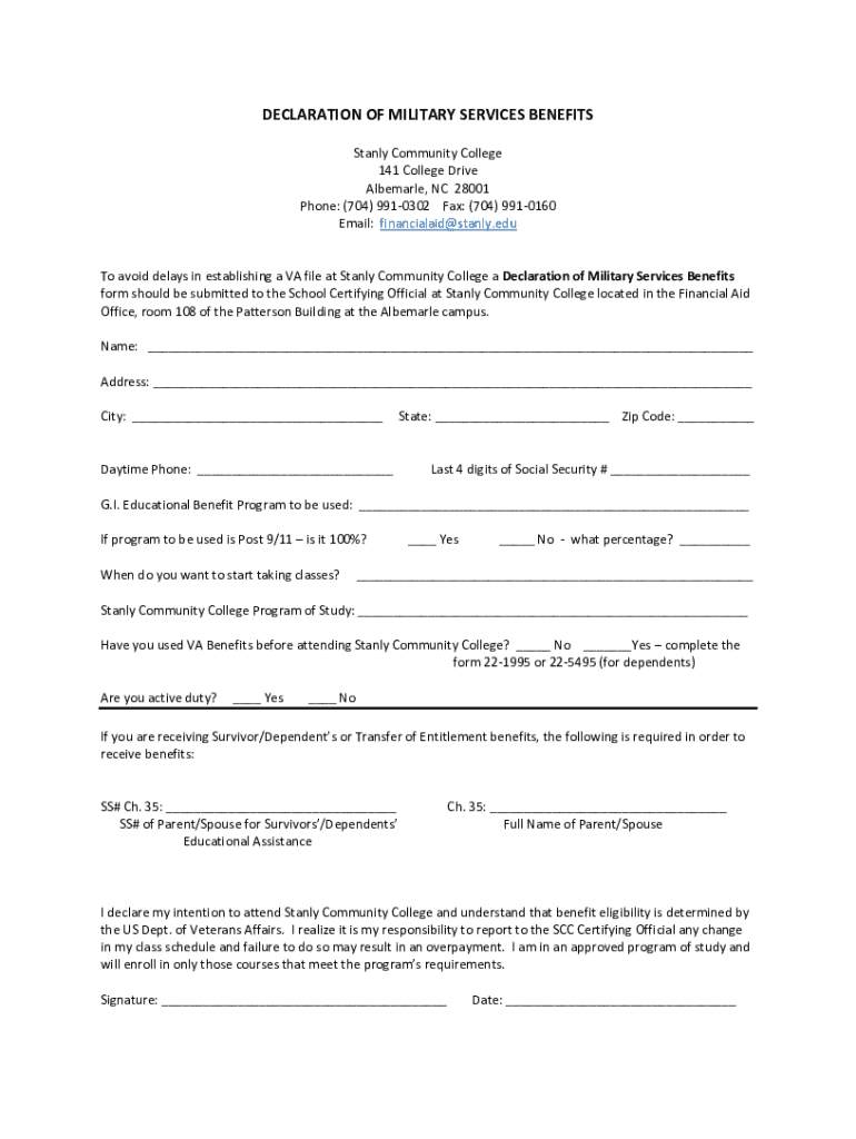 El formulario de declaración de beneficios de servicios militares debe ser presentado al oficial certificador de la escuela en el Stanly Community College para establecer un archivo VA. Recoge información sobre el solicitante, los beneficios a utilizar y la intención de inscribirse en clases.