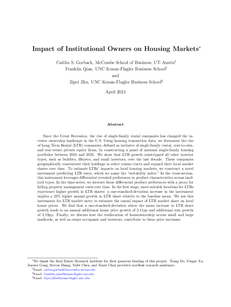 Impact of Institutional Owners on Housing Markets Caitlin S. Gorback, McCombs School of Business, UTAustin Franklin Qian, UNC KenanFlagler Business School and Zipei Zhu, UNC KenanFlagler Business