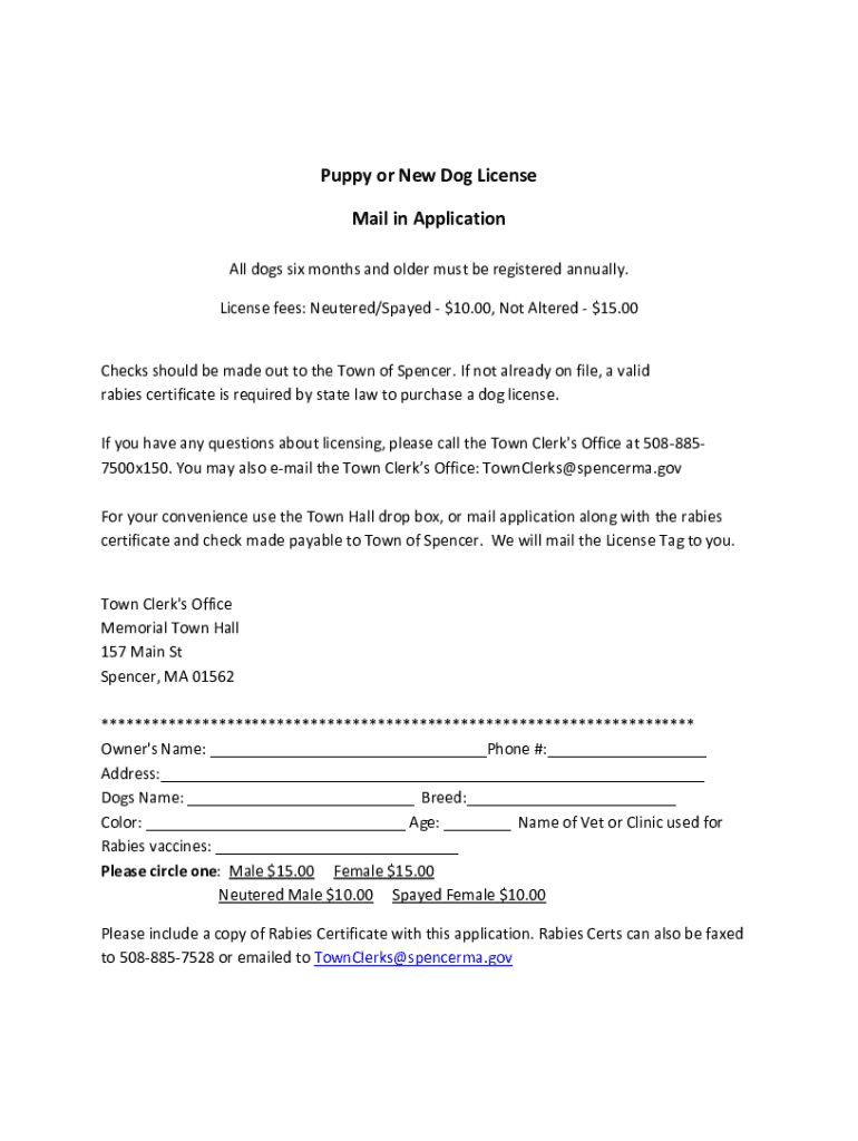 Application form for registering a dog in the Town of Spencer. Required for all dogs six months and older to obtain a license. Includes information on fees, required documents, and contact details for the Town Clerk\'s Office.