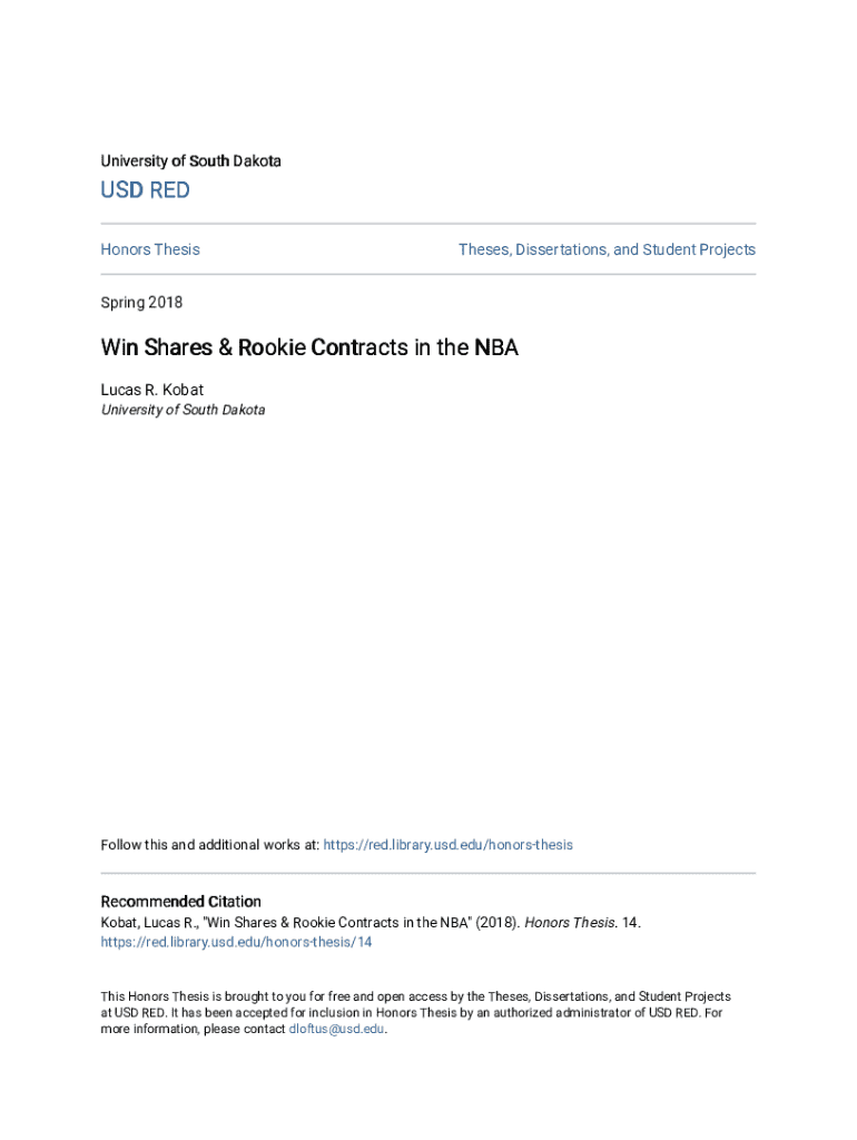 University of South DakotaUSD RED Honors ThesisTheses, Dissertations, and Student ProjectsSpring 2018Win Shares & Rookie Contracts in the NBA Lucas R. Kobat University of South DakotaFollow this and