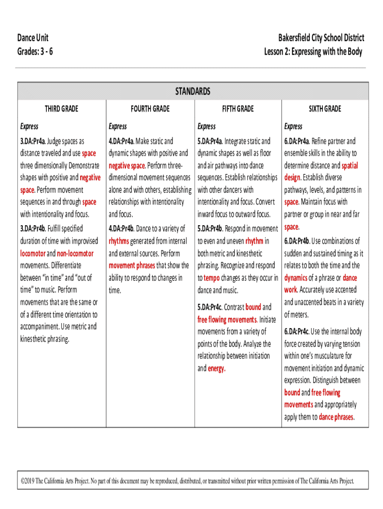 This document provides a comprehensive lesson plan for teaching dance to students in grades 3 to 6, focusing on the use of body movement, spatial awareness, rhythms, and expressive qualities in dance. It includes standards, teaching strategies, formative assessments, and vocabulary related to dance movements and techniques.