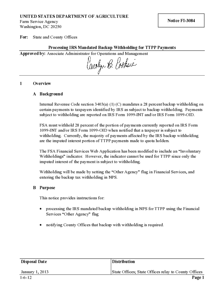 This notice provides instructions for processing the IRS mandated backup withholding in NPS for TTPP payments, details on notifying County Offices, and guidance on how to handle the necessary flag settings and documentation.