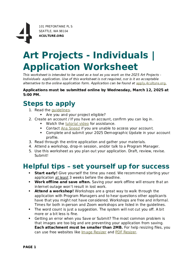 Instructions for the Art Projects - Individuals | Application Worksheet form