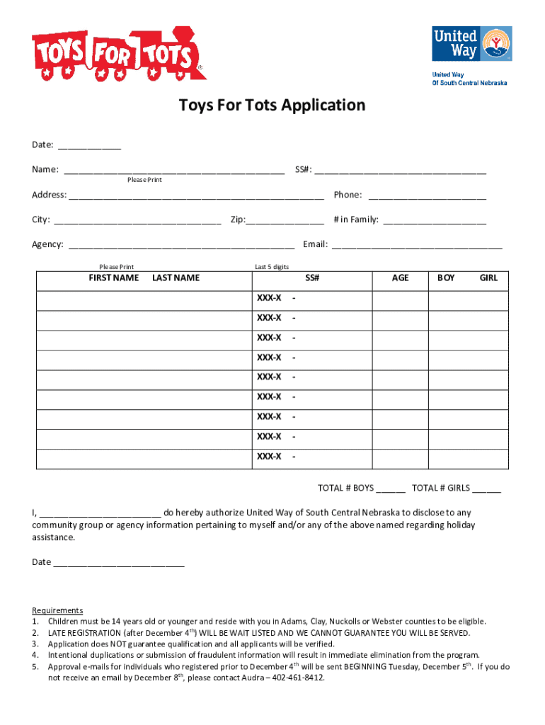 Toys For Tots Application Date: ___ Name: ___ Please PrintSS#: ___Address: ___ Phone: ___ City: ___Zip:___ # in Family: ___Agency: ___ Email: ___ Please PrintFIRST NAMELAST NAMELast 5 digitsSS#XXXXXXXXXXXXXXXXXXXXXXXXXXXXXXXXXXXXAGEBOYGIRLTOTAL