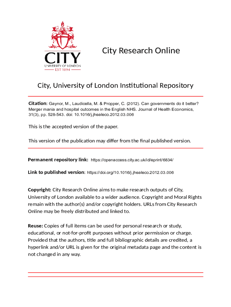 City Research OnlineCity, University of London Institutional Repository Citation: Gaynor, M., Laudicella, M. & Propper, C. (2012). Can governments do it better? Merger mania and hospital outcomes