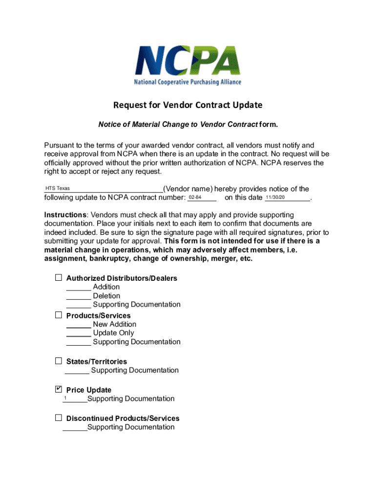 Request for Vendor Contract Update Notice of Material Change to Vendor Contract form. Pursuant to the terms of your awarded vendor contract, all vendors must notify and receive approval from NCPA