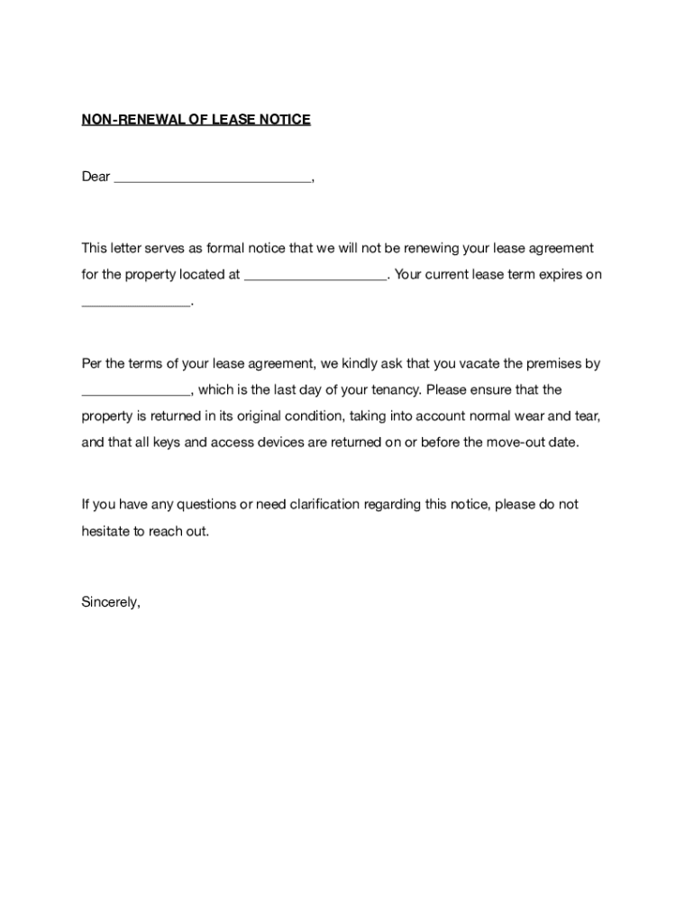 NONRENEWAL OF LEASE NOTICEDear ___,This letter serves as formal notice that we will not be renewing your lease agreement for the property located at ___. Your current lease term expires on ___.Per