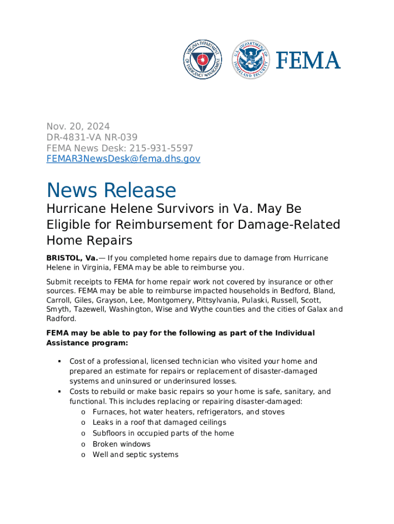News Release Hurricane Helene Survivors in Va. May Be ... template instructions