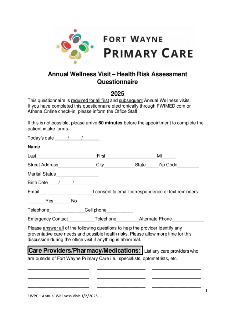 Annual Wellness Visit Health Risk Assessment Questionnaire 2025 This questionnaire is required for all first and subsequent Annual Wellness visits. If you have completed this questionnaire electronically