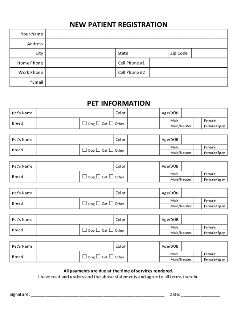This form is used to register new patients along with their pet information, including personal details and pet characteristics.