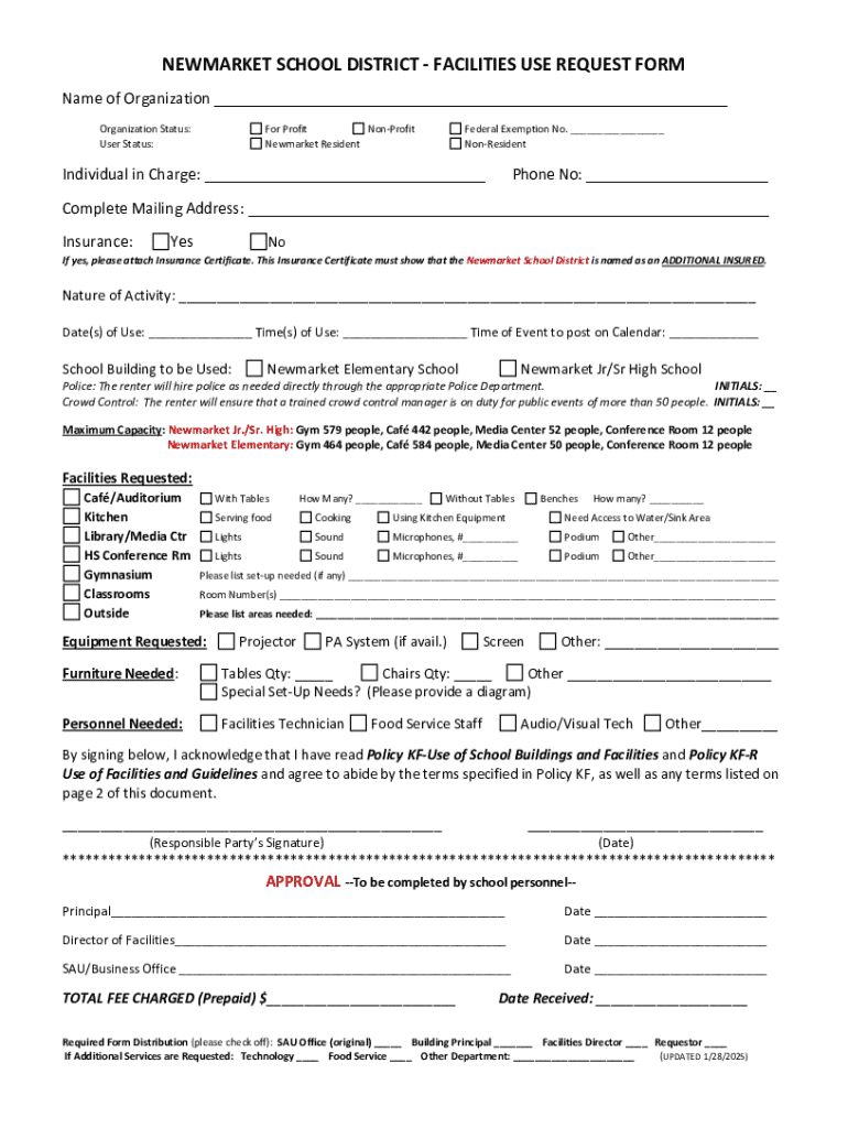 NEWMARKET SCHOOL DISTRICT FACILITIES USE REQUEST FORM Name of Organization ___ Organization Status: User Status:For Profit NonProfit Newmarket ResidentFederal Exemption No. ___ NonResidentIndividual
