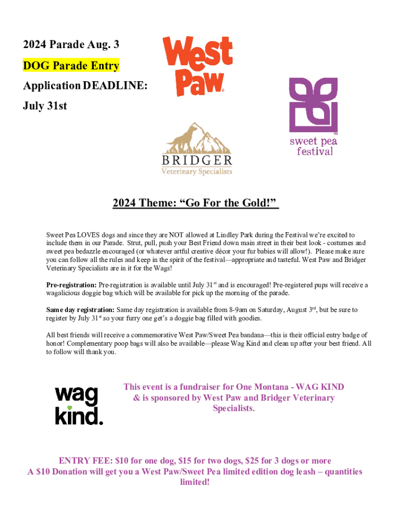 2024 Parade Aug. 3 DOG Parade Entry Application DEADLINE: July 31st2024 Theme: Go For the Gold! Sweet Pea LOVES dogs and since they are NOT allowed at Lindley Park during the Festival were excited