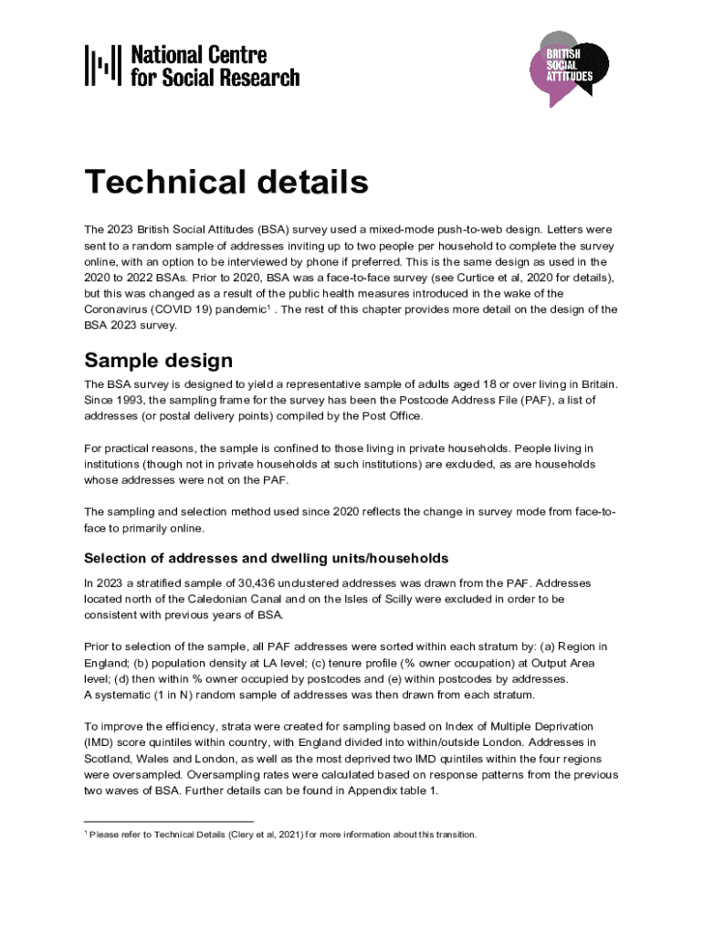 Technical details The 2023 British Social Attitudes (BSA) survey used a mixedmode pushtoweb design. Letters were sent to a random sample of addresses inviting up to two people per household to complete