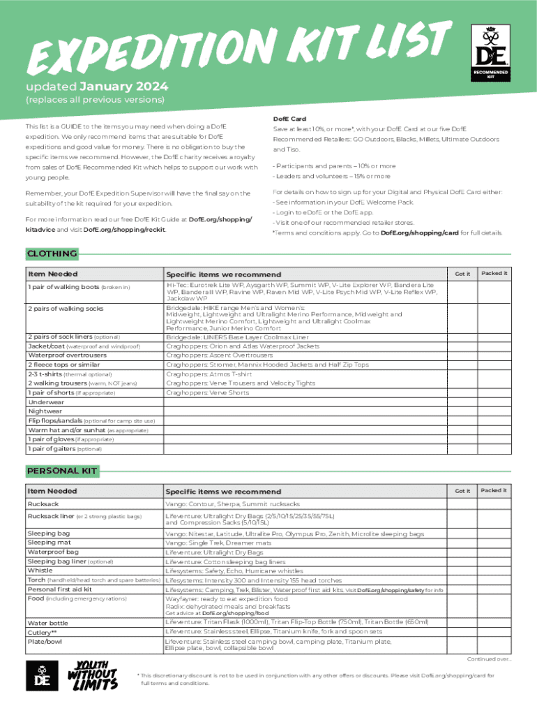 t s i L t i K n o i t Expediupdated January 2024 (replaces all previous versions)DofE CardThis list is a GUIDE to the items you may need when doing a DofESave at least 10%, or more*, with your DofE
