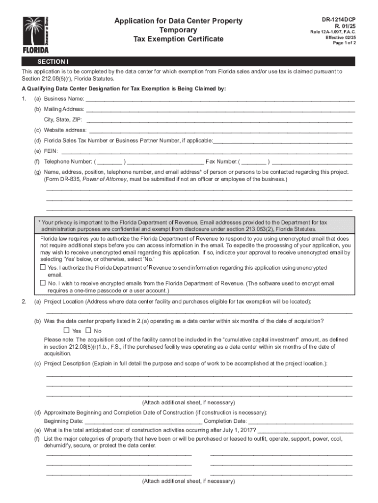 Este formulario es para que el centro de datos complete la solicitud de exención del impuesto sobre ventas y/o uso de Florida, según la Sección 212.08(5)(r) de los Estatutos de Florida.