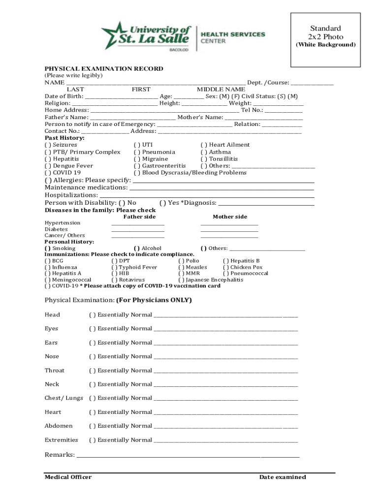 Standard 2x2 Photo (White Background)PHYSICAL EXAMINATION RECORD (Please write legibly) NAME ___ Dept. /Course: ___ LAST FIRST MIDDLE NAME Date of Birth: ___ Age: ___ Sex: (M) (F) Civil Status: (S)