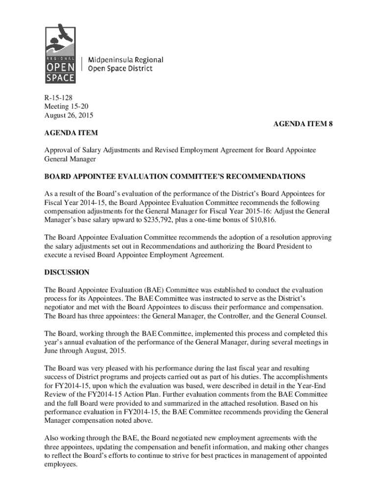 Este documento incluye la aprobación de ajustes salariales y un acuerdo de empleo revisado para el Gerente General basado en la evaluación del Comité de Evaluación de los Apuntados por el Consejo. Se detalla la recomendación de ajustes en la compensación, bonificaciones y revisiones del desempeño del Gerente General durante el año fiscal 2014-15.