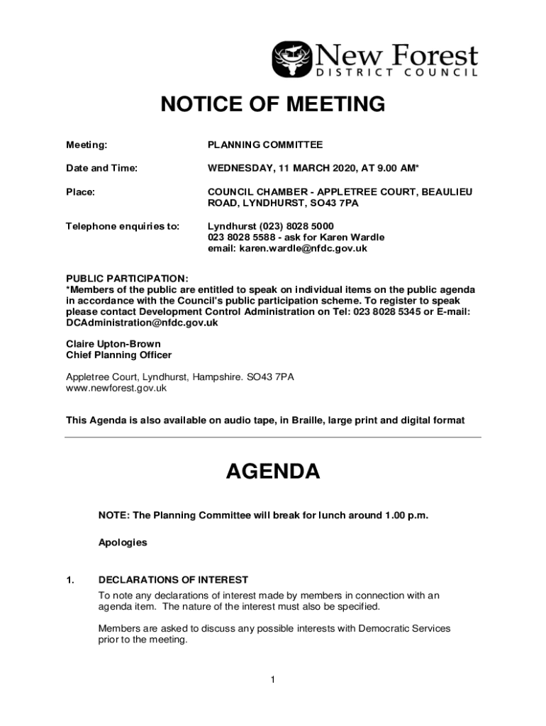 NOTICE OF MEETING Meeting:PLANNING COMMITTEEDate and Time:WEDNESDAY, 11 MARCH 2020, AT 9.00 AM*Place:COUNCIL CHAMBER APPLETREE COURT, BEAULIEU ROAD, LYNDHURST, SO43 7PATelephone enquiries to:Lyndhurst