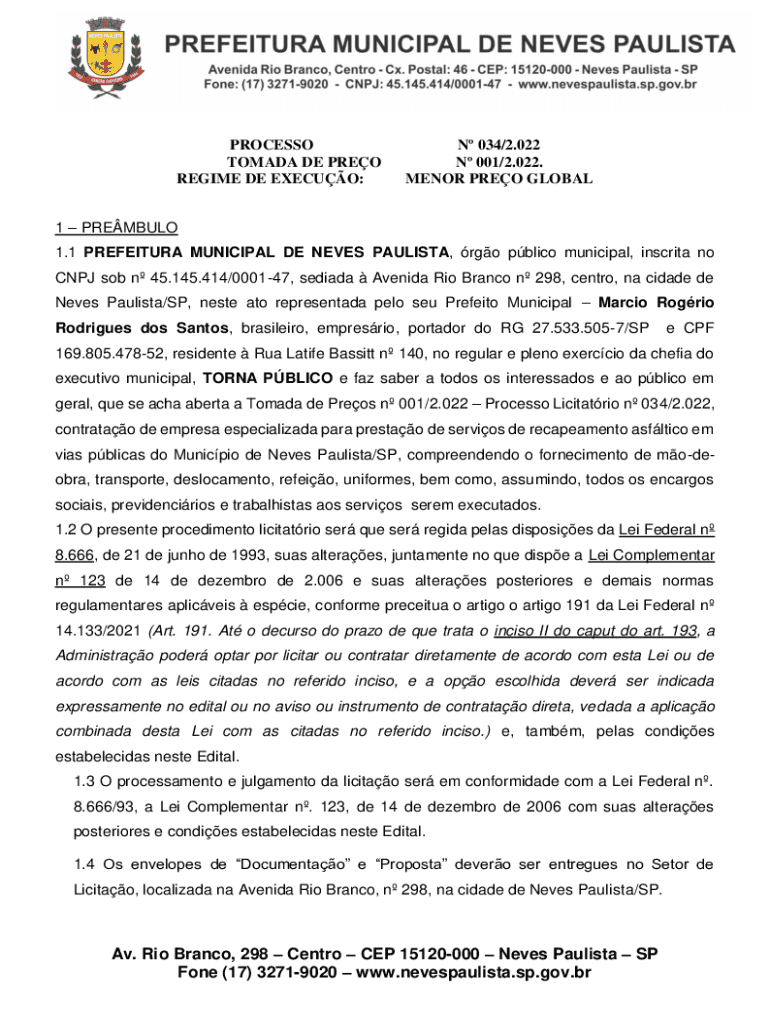 PROCESSO TOMADA DE PREO REGIME DE EXECUO:N 034/2.022 N 001/2.022. MENOR PREO GLOBAL1 PREMBULO 1.1 PREFEITURA MUNICIPAL DE NEVES PAULISTA, rgo pblico municipal, inscrita no CNPJ sob n 45.145.414/000147, sediada Avenida Rio Branco n 298, centro, na cidade de Neves Paulista/SP, neste ato representada pelo seu Prefeito Municipal Marcio Rogrio Rodrigues dos Santos, brasileiro, empresrio, portador do RG 27.533.5057/SPe CPF169.805.47852, residente Rua