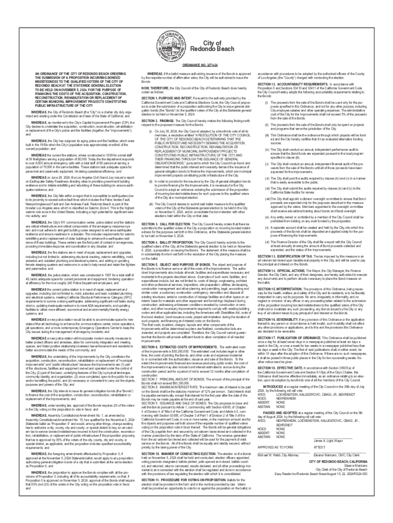 City of Redondo Beach ORDINANCE NO. 327424 AN ORDINANCE OF THE CITY OF REDONDO BEACH ORDERING THE SUBMISSION OF A PROPOSITION INCURRING BONDED INDEBTEDNESS TO THE QUALIFIED VOTERS OF THE CITY OF REDONDO