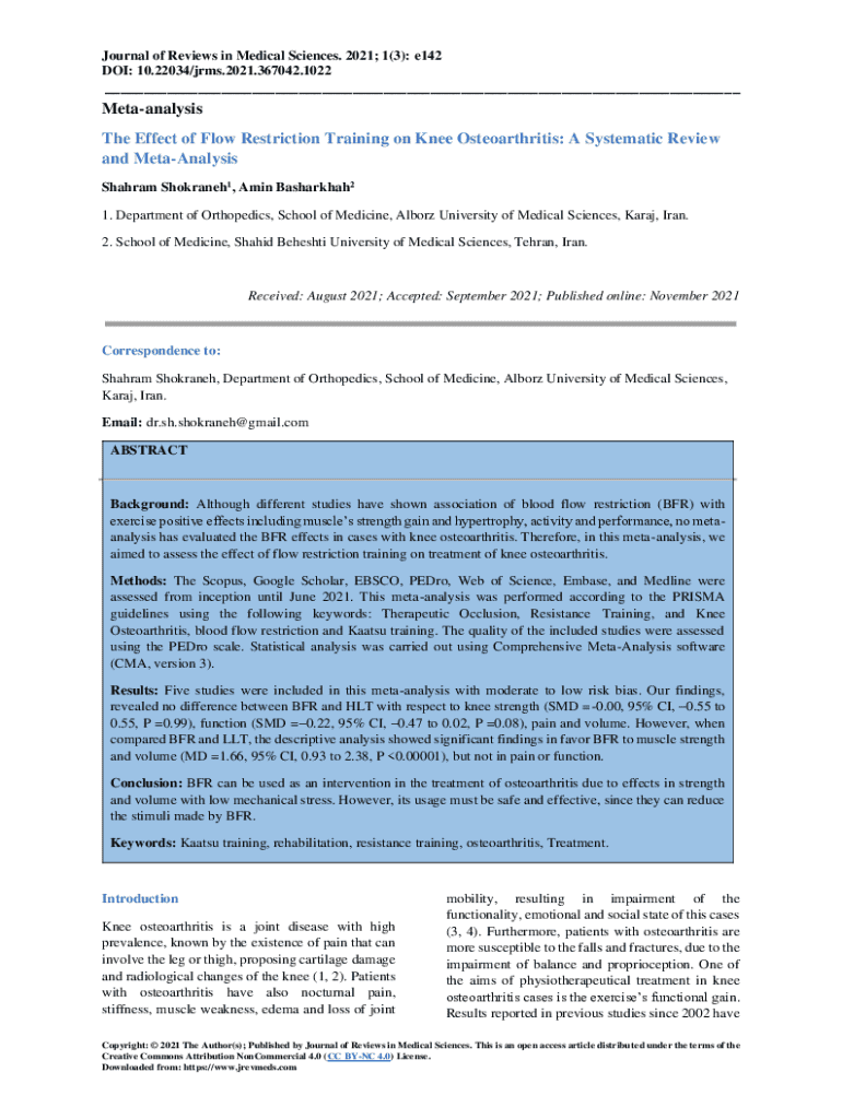 Journal of Reviews in Medical Sciences. 2021; 1(3): e142 DOI: 10.22034/jrms.2021.367042.1022___Metaanalysis The Effect of Flow Restriction Training on Knee Osteoarthritis: A Systematic Review and MetaAnalysis Shahram Shokraneh1, Amin Basharkhah2 1. Department of Orthopedics, School of Medicine, Alborz University of Medical Sciences, Karaj, Iran. 2. School of Medicine, Shahid Beheshti University of Medical Sciences, Tehran, Iran.Received: August 2021; Accepted: September 2021; Published online: