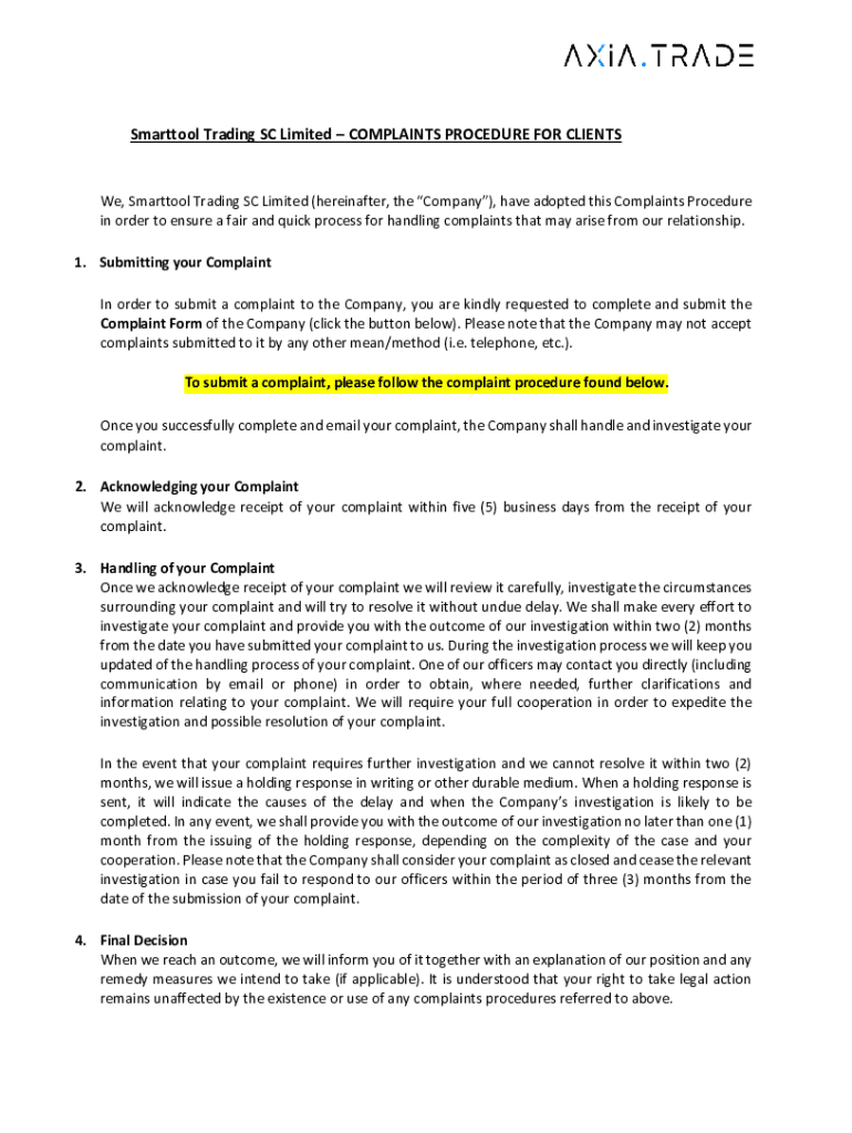 This document outlines the complaints procedure for clients of Smarttool Trading SC Limited, detailing the steps to submit a complaint, acknowledgment, handling, and resolution process.