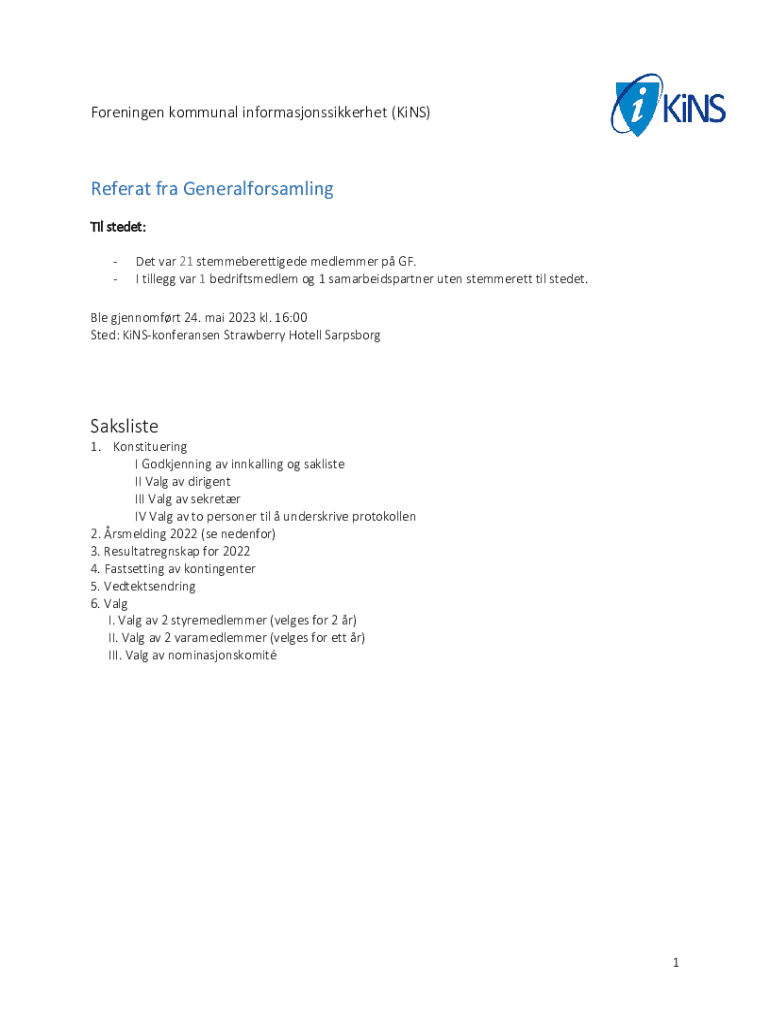 Foreningen kommunal informasjonssikkerhet (KiNS)Referat fra Generalforsamling Til stedet: Det var 21 stemmeberettigede medlemmer p GF. I tillegg var 1 bedriftsmedlem og 1 samarbeidspartner uten stemmerett til stedet.Ble gjennomfrt 24. mai 2023 kl. 16:00 Sted: KiNSkonferansen Strawberry Hotell SarpsborgSaksliste1. Konstituering I Godkjenning av innkalling og sakliste II Valg av dirigent III Valg av sekretr IV Valg av to personer til underskrive protokollen 2. rsmelding 2022 (se nedenfor) 3