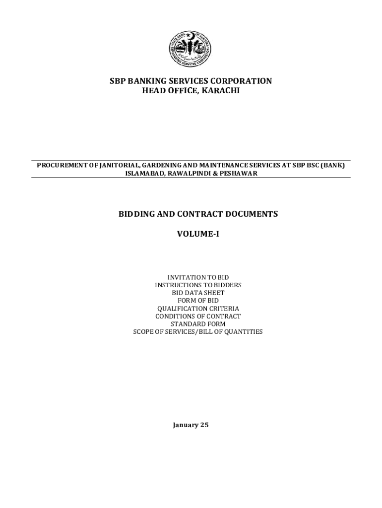 This document outlines the bidding and contract procedures for the procurement of janitorial, gardening, and maintenance services for various field offices of the State Bank of Pakistan Banking Services Corporation. It includes detailed instructions for bidders, scope of services, qualifications, bidding data sheet, and conditions of the contract.