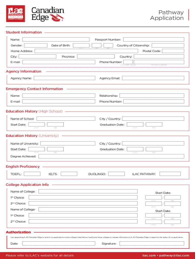 This form is designed to collect student information, education history, agency information, and college application choices for students applying to colleges through ILAC/Canadian Edge.