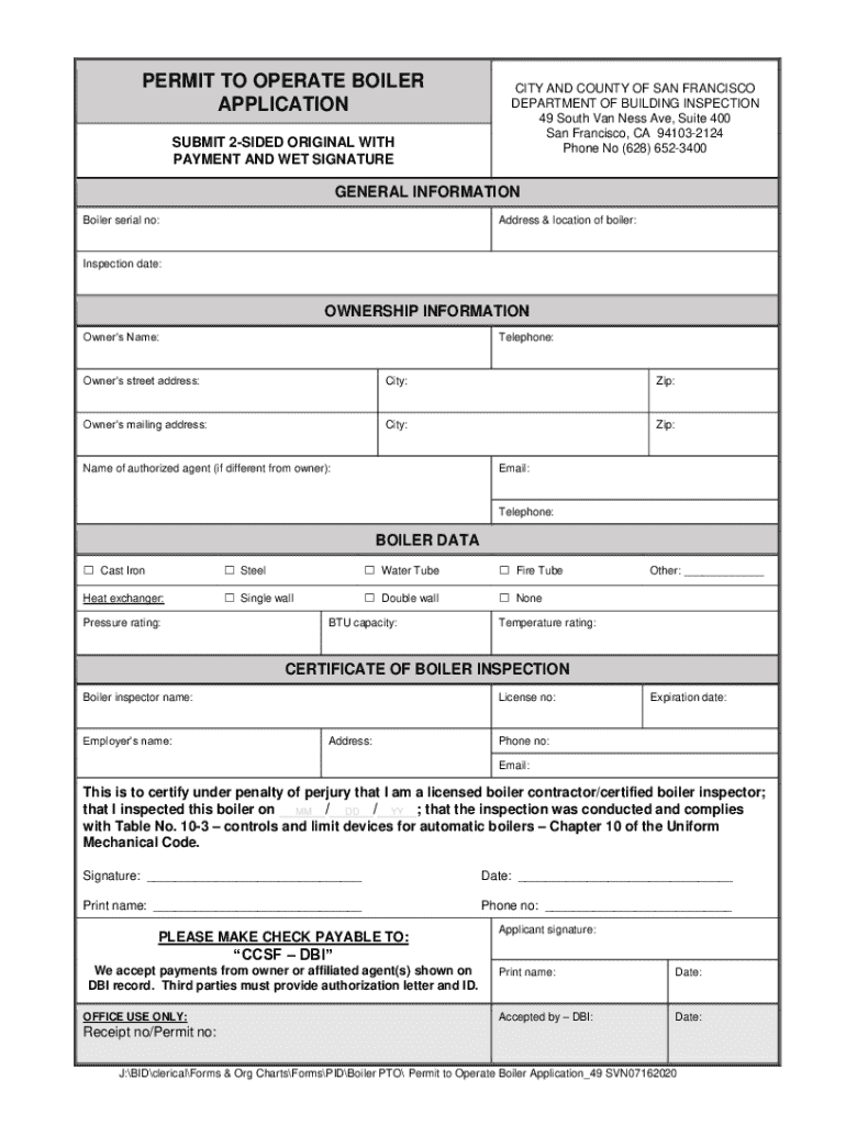 This document is an application for a permit to operate a boiler, requiring details about the boiler, owner information, inspection details, and necessary certifications.