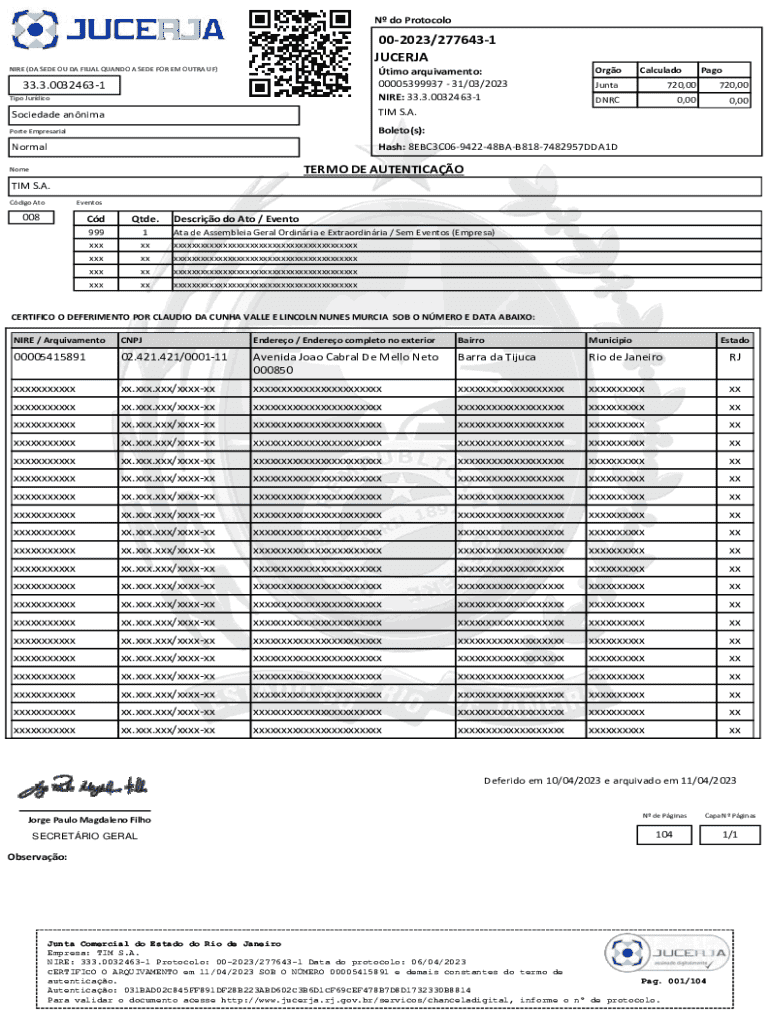 N do Protocolo002023/2776431 JUCERJA NIRE (DA SEDE OU DA FILIAL QUANDO A SEDE FOR EM OUTRA UF)OrgoSociedade annimatimo arquivamento: 00005399937 31/03/2023 NIRE: 33.3.00324631 TIM S.A.Porte EmpresarialBoleto(s):NormalHash: 8EBC3C06942248BAB8187482957DDA1D33.3.00324631 Tipo JurdicoCalculadoPagoJunta720,00720,00DNRC0,000,00TERMO DE AUTENTICAONomeTIM S.A. Cdigo AtoEventos008CdQtde.999 xxx xxx xxx xxx1 xx xx xx xxDescrio