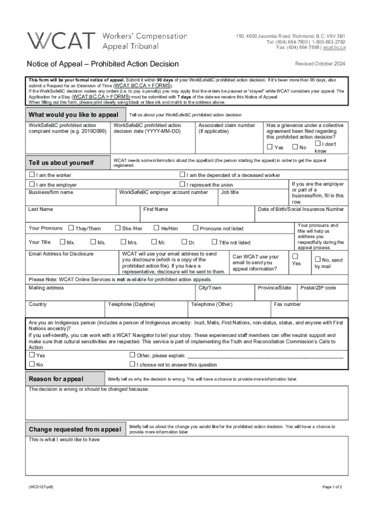 Este formulario será su aviso formal de apelación. Preséntelo dentro de los 90 días de la decisión de acción prohibida de WorkSafeBC. Si han pasado más de 90 días, también presente una Solicitud de Extensión de Tiempo. Si la decisión de WorkSafeBC emite alguna orden, puede solicitar que las órdenes se suspendan mientras WCAT considera su apelación.