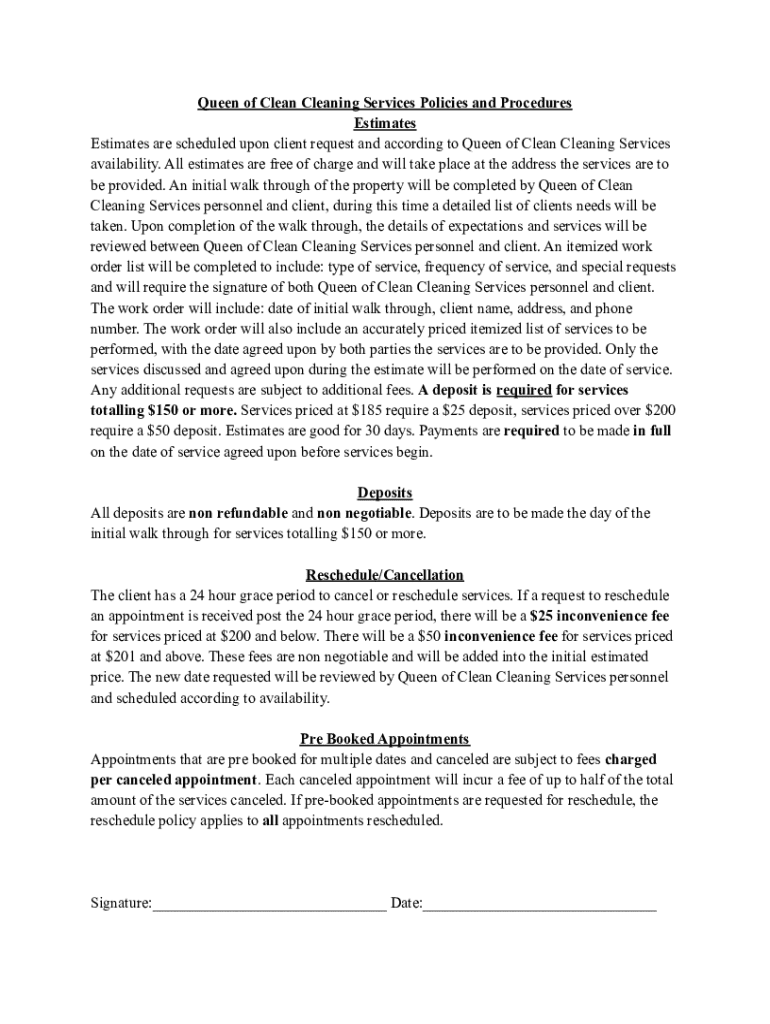 This document outlines the policies and procedures for the Queen of Clean Cleaning Services, including information about estimates, deposits, rescheduling, cancellation policies, and client obligations.