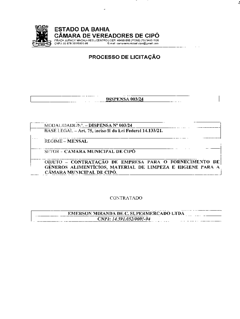 ESTADO DA BAHIA CMARA DE VEREADORES DE CIP PRAA JURACY MAGALHES | CENTRO | CEP: 48450000 | FONE (75) 34351005 CNPJ. 03.578.301/000195 Email: camaramunicipal.cipo@gmai! comPROCESSO DE LICITAODISPENSA 003/24JMODALIDADE/N0. DISPENSA N# 003/24 BASE LEGAL Art. 75, inciso II da Lei Federal 14.133/21. REGIMEMENSAL SETOR CAMARA MUNICIPAL DE CIPO OBJETO CONTRATAO DE EMPRESA PARA O FORNECIMENTO DE GNEROS ALIMENTCIOS, MATERIAL DE LIMPEZA E HIGIENE PARA Ai CMARA MUNICIPAL DE CIP