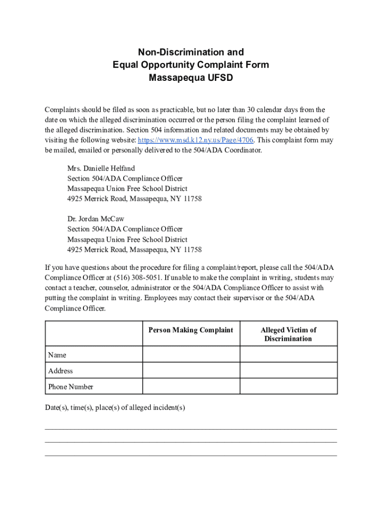 Este formulario permite a los individuos presentar quejas relacionadas con la discriminación en el Distrito Escolar de Massapequa. Las quejas deben ser presentadas dentro de un plazo de 30 días desde el incidente. Se incluye información sobre cómo comunicarse con los Oficiales de Cumplimiento de la Sección 504/ADA.