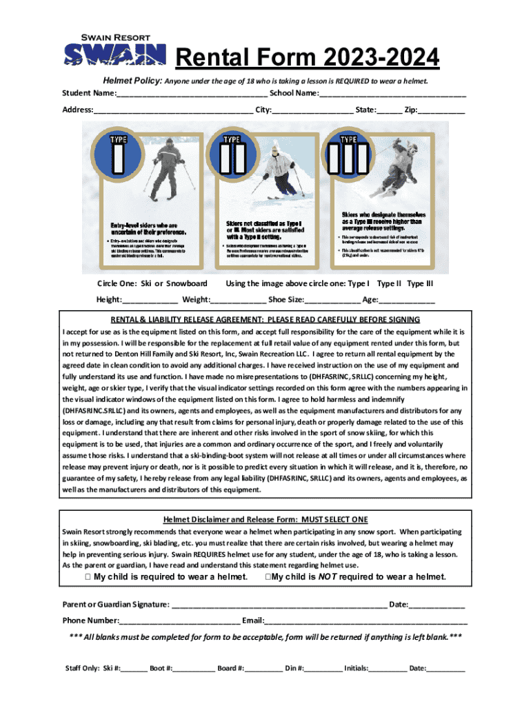 This form is used to rent skiing and snowboarding equipment for students and includes a liability release agreement regarding the use of the equipment and helmet policy.